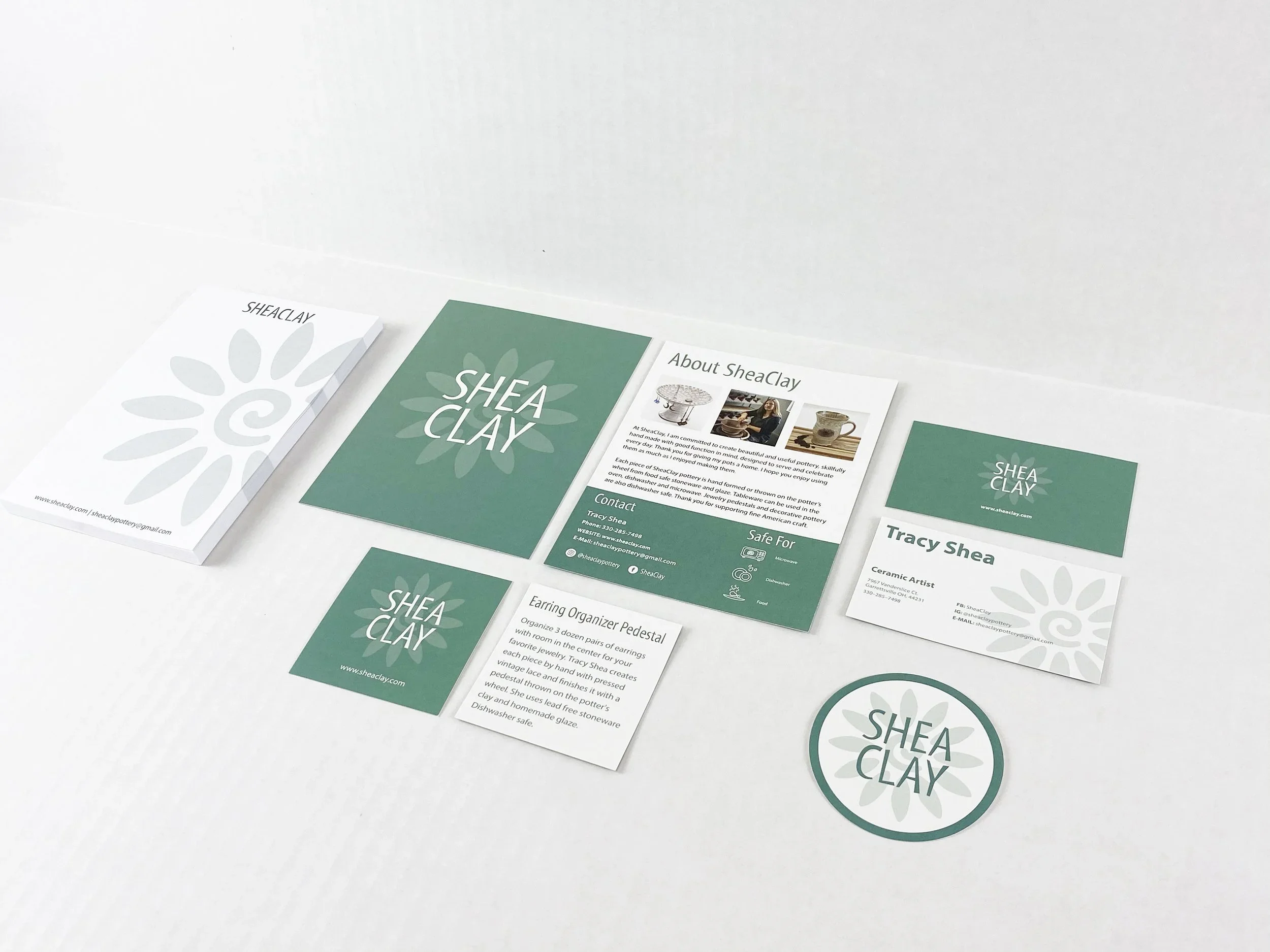This project was designed to give SheaClay a brand identity. We created a logo, color scheme, and printables to take to galleries or display in stores. The sizes range from 3”x3” to 3.5”x5”. This font in this logo was chosen because it represents how writing looks etched in clay. The swirl is another key element to the SheaClay branding because it was used previously in the branding as an identifiable mark but also represents the spinning motion of the wheel.