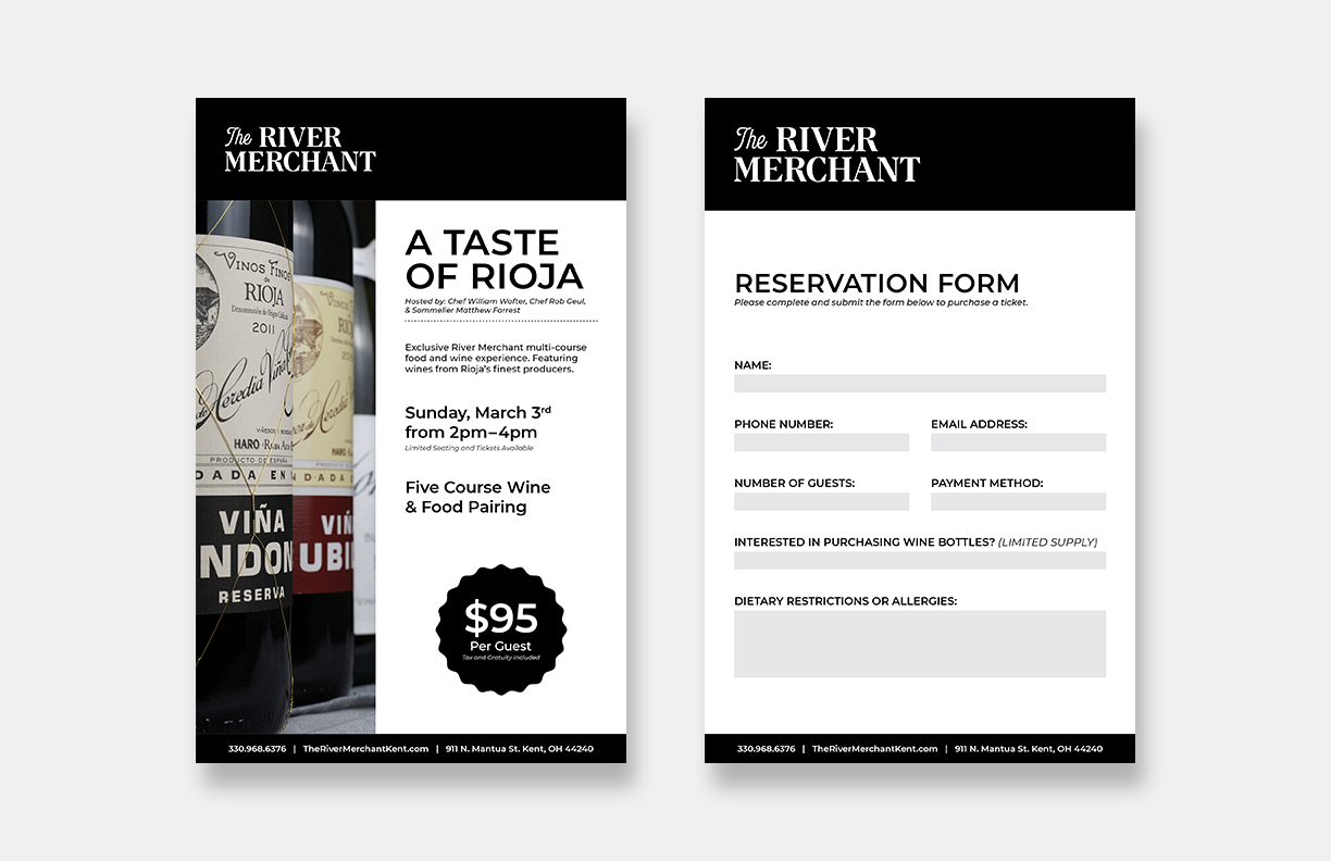 This project was designed as a sign-up sheet for a private event held at The River Merchant. There were limited tickets being sold and this was created to take count of how many people were interested in attending. This sheet was designed at 5.5”x8.5”.