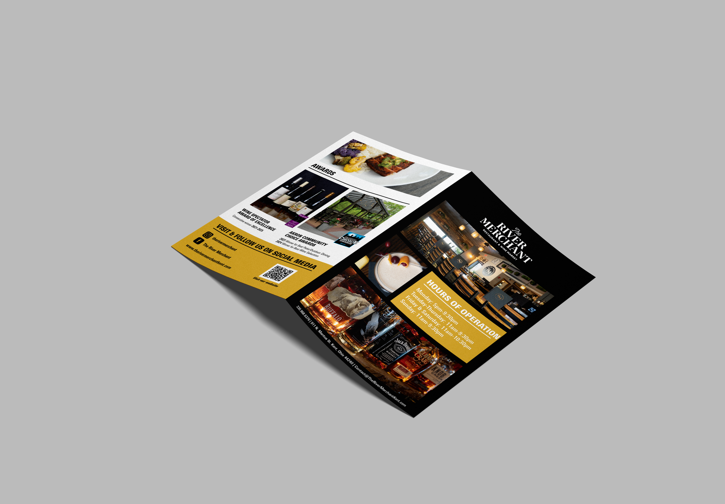This project was designed to house information about The River Merchant and to pass out at various events as well as live in the front of the restaurant. It was designed on 8.5” x 11” paper. All images within the bifold were taken by Shea Media & Design.